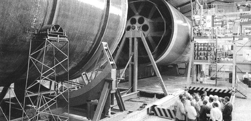 Figura 2 Las monopiezas composite no tienen prácticamente limitación de tamaño: son posibles piezas mucho mayores que estas tuberías bobinadas en UP Palatal-fibra contínua, a punto de desmoldeo, con 7 metros de diámetro.