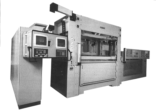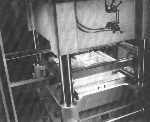 Figura 3. El moldeo se completa con instalaciones automatizadas para todas las operaciones auxiliares, adaptadas al sistema de traslación de las láminas conformadas, por lo que las instalaciones de punzonado (recorte) como la ilustrada tienen movimiento vertical en ambas mitades de la matriz.
