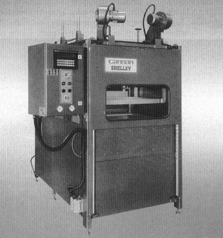 Las placas cortadas se sujetan mediante marcos dobles, accionados habitualmente por aire. Para evitar que colapse la placa al calentarse se la soporta mediante un colchón de aire a presión. Los marcos se desplazan mediante raíles con vis-sin-fin o con pistones neumáticos o hidráulicos. En los equipos más simples, la plancha se sujeta sobre el molde hembra y se desplaza sobre ella el elemento calentador. Estos conjuntos para el moldeo de lámina cortada pueden montarse también sobre un carrusel, que efectúa una operación distinta en cada estación de su rotación.