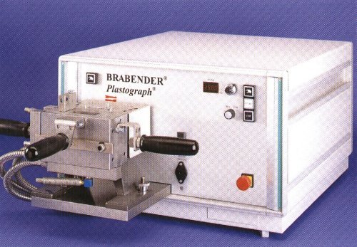 Figura 2 Este aparato permite ensayar la calidad y procesabilidada de los termoplásticos y otros materiales obteniendo un gráfico de torque y temperatura respecto a tiempo del que se deducen diversos parámetros de producción. Ensayo de tracción-impacto-La probeta puede o no tener entalla y se somete a una fuerza repartida por toda la sección, hasta la rotura. Este ensayo, más costoso, se suele utilizar cuando no ha habido rotura en el ensayo Charpy. La probeta se fija por un extremo y se sujeta por otro a un yugo móvil que es el que recibe, por ambos lados de la probeta, el golpe del martillo que tiene la parte inferior hendida convenientemente, de modo que la probeta sufre siempre un golpe a tracción.