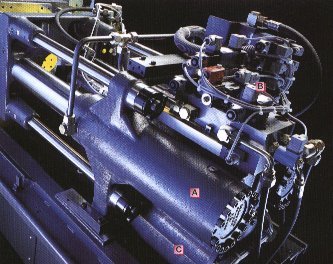 Figura 3 La inyectora se ha diseñado siguiendo un concepto ya comprobado en las máquinas ERGOtech más grandes; cilindro plastificador, cilindro de inyección e hidromotor se encuentran en un eje y las juntas de gran calidad impiden las fugas al aumentar la presión. Las máquinas incorporan, además de la calidad mecánica y las unidades de plastificación clásicas de Demag, la bomba autorregulada DFE, instalada en más de 4.000 máquinas ERGOtech en el mercado.