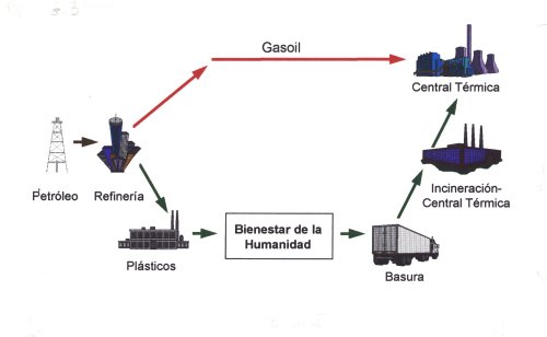 El reciclado térmico consiste en quemar residuos sólidos como combustible para la producción de vapor y de energía tal y como se produce en una central térmica. Una solución elegante es la mostrada en el gráfico 3, que consiste en desviar una parte del petróleo de la combustión directa para producir plásticos que sirven al bienestar de la humanidad y, después, recuperar su contenido energético.