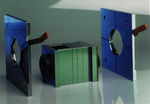 | Los sistemas de cambio mecano-hidráulicos implican que los moldes estén dotados de placas de base de medidas normalizadas (Euronorm) según el tipo de máquina en que deban instalarse | Los módulos magnéticos están disponibles en dos versiones: integrados en los platos porta-moldes o en forma de placas-módulo que se fijan sobre los taladros Euromap existentes |