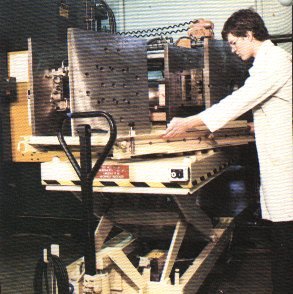 El sistema se completa con una variedad de carros portamoldes roll-on roll-outde altura regulable, hasta 20 T de carga admisible, con una cama de rodillos giratoria para colocar el molde que se extrae y, después del giro, emplazar correctamente el molde a situar. Son factibles, lógicamente, la carga o descarga superiores, aunque precisan de un desplazamiento longitudinal una vez situados los moldes a la altura correcta para liberar el saliente del elemento de bloqueo superior.