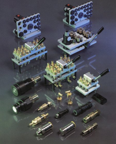 Figura 5 Los sistemas Enerpac se completan con una variedad de acopladores simples y múltiples, manuales o automáticos, que simplifican extraordinariamente estas operaciónes y pueden incorporarse a otros sistemas de cambio rápido de moldes. Como puede comprobarse por lo que antecede, existen medios para diseñar un sistema de cambio rápido de moldes específico para cada taller de moldeo, en cuya definición pueden colaborar técnicos y operadores del mismo y los de las empresas fabricantes de sistemas, al objeto de obtener la máxima rentabilidad de la instalación.