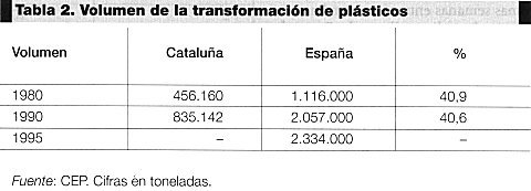 Estimaciones del Centro Español de Plásticos del año 1980 indican que en Cataluña el volumen de transformación era del 41%, como se refleja en la tabla 2. Diez años después, el porcentaje apenas había variado, y referido al valor de la transformación la cifra es sensiblemente parecida, como se ve en la tabla 3. Datos de otras fuentes, aunque no siempren son homogéneos, sugieren que este porcentaje se ha mantenido en los últimos años.