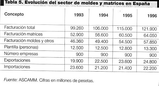 Tabla 5 Evolución del sector de moldes y matrices en EspañaEn los últimos años, la desaparición de empresas de fabricación de maquinaria para plásticos ha sido importante, tanto en Cataluña como en el resto de España y no se han creado apenas de nuevas. Algunas han cobrado más importancia, pero tampoco se ha alterado sustancialmente el predominio catalán en este terrero.