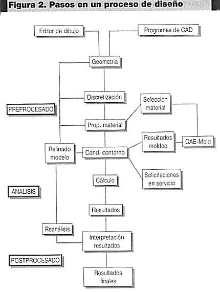 Los programas de cálculo por elementos finitos son herramientas de programación muy potentes y versátiles. De ahí que para su mejor comprensión se suelen estructurar en una serie de etapas básicas que, a su vez, se desglosan en más pasos simples. En la figura 2 se distiguen las diversas partes que configuran un proceso de diseño mediante elementos finitos: preprocesa, análisis y postprocesado.