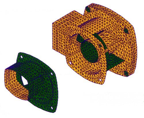 En la figura 6 se muestra la discretización definitiva de la carcasa. Se ha preferido una división en base a elementos triangulares puesto que en otro caso (malla de paralelepípedos) la topología compleja de las regiones a mallar implicaba operar con elementos muy deformados.