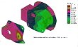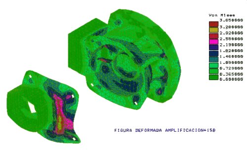 La máxima separación entre cuerpo y tapa de la carcasa se da axialmente en la dirección del eje z, resultando ser de 0,11 mm (figura 9). Se puede asegurar, pues, que no se producirán fugas en servicio ya que esta separación es menor que la admisible (0,5 mm). Los valores de las deformaciones son prácticamente despreciables (del orden del 0,15%), por lo que no existirán deformaciones permanentes en la pieza.
