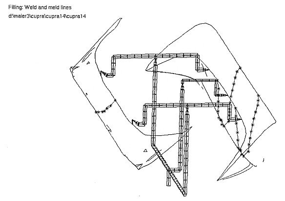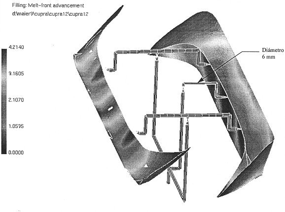 Finalmente se estudia la inclusión de una cámara caliente central adicional. Como el recorrido del material por el canal central es menor que por los extremos, en la simulación se han optimizado los diámetros: todos son de 10 mm excepto en canal central que se ha reducido a 6 mm (figura 5). El resultado son tres frentes de llenado en la cavidad mayor de manera que las líneas de unión se sitúan en una zona de menor compromiso (cara inferior del spoiler) y son menos marcadas. Esta solución es la que se adoptó en el molde, con resultados satisfactorios.