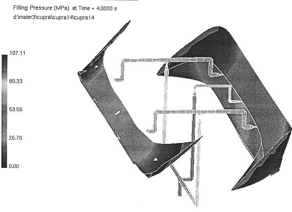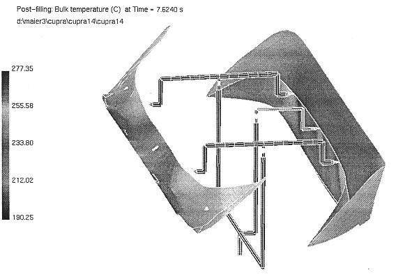 La simulación permite definir la duración de las fases de compactación y de enfriamiento, óptimizando el tiempo total de ciclo, con la consiguiente mejora de calidad y producción. Al cabo de 7.62 s los puntos de inyección se encuentran a 1901C, mientras que el resto de la cavidad está a una temperatura superior (figura 10). Aunque se mantenga más tiempo la presión de compactación ésta no tendrá efecto sobre la pieza porque los puntos de inyección se encuentran solidificados. Este enfriamiento prematuro, junto con la distribución de tensiones de cizalla observada (figura 9), indican que el diámetro (2 mm) de los puntos de inyección debe aumentarse, con la consiguiente reducción en la presión de inyección requerida, de la fuerza de cierre, y de las tensiones de cizalla inducidas. Esto a su vez se traduce en un menor recalentamiento del material y una distribución de temperaturas más uniforme a lo largo de las cavidades.