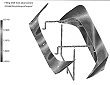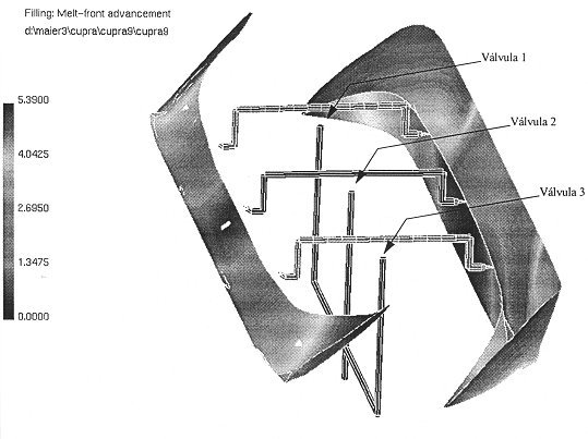 Finalmente se ha procedido a la simulación de la inyección del spoiler suponiendo la utilización de boquillas provistas de válvulas con control de apertura/cierre (inyección secuencial). Se ha supuesto un tiempo de llenado de 5 s, manteniendo las demás condiciones de procesado como en el caso anterior (figura 14). Las válvulas 1 y 3 se abren a los 2.5 s de comenzar el llenado y todas se mantienen abiertas hasta el final de la fase de compactación. Se aprecia que cuando se abren las válvulas 1 y 3 los frentes de llenado han superado los puntos de inyección correspondientes por lo que no existen líneas de unión (figura 15). Las distribuciones de presiones de inyección, temperaturas del material y tensiones de cizalla calculadas son equivalentes a las observadas con una inyección convencional (figura 16).