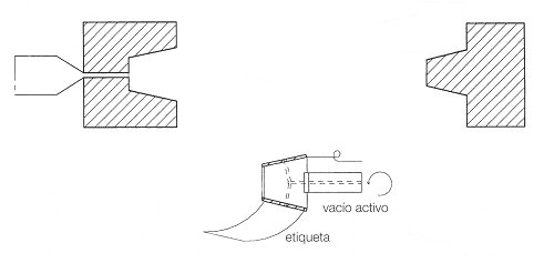 Otra forma de sujetar la etiqueta al moldes es, como se ha dicho, mediante fuerzas electroestáticas. Sin embargo, con el fin de poder ajustarse a las diferentes configuraciones de cada molde, los electrodos deben ser diseñados de forma individual para cada caso concreto. Asimismo, nos encontramos con otro inconveniente, como es el hecho de que este sistema requiere un voltaje relativamente alto, con el peligro que esto supone de que las chispas causen un cortocircuito.