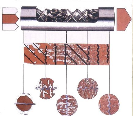 Para eliminar tales efectos colaterales, el mezclador estático Sulzer para extrusión, modelo SSM-X, se instala entre la cabeza de la extrusora (después del husillo) y la hilera (fig. 3). El mezclador SSM-X, consistente en una serie de elementos de mezcla tipo SMX, mejora la homogeneidad de la temperatura, color y viscosidad hasta en un factor de 5.
