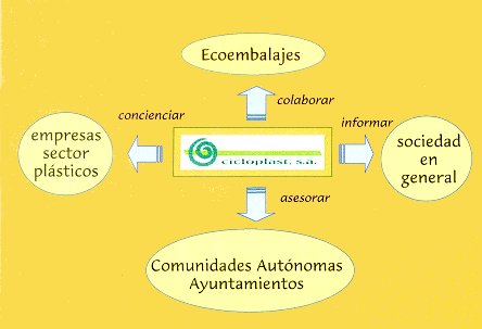 Cicloplast se crea en noviembre de 1996 con el objetivo de promover y coordinar la gestión de residuos plásticos en todo el territorio nacional. Está formada por productores de materia prima, fabricantes de envases y representantes de la industrias recicladoras de plásticos. Dadas las obligaciones de todos éstos ante la Ley de Envases, Cicloplast asume, en nombre de sus accionistas, la responsabilidad de retoma y garantía de reciclado para responder al objetivo de la ley para los plásticos. De esta manera, las empresas afiliadas a Cicloplast se aseguran el cumplimiento de ley y evitan sanciones que pueden llegar hasta los 100 Mpts.
