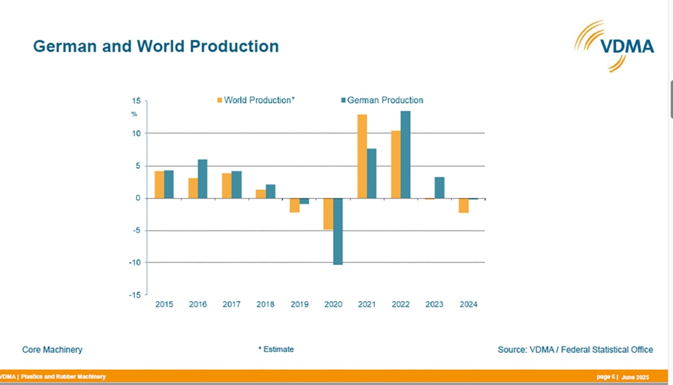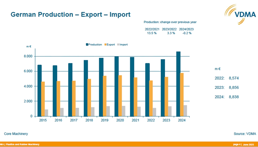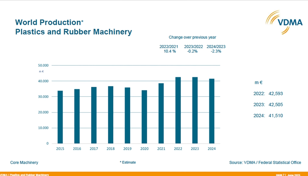 El año 2024 fue nuevamente complicado para los fabricantes alemanes de maquinaria para plásticos y caucho. Según datos de la asociación sectorial VDMA, los pedidos recibidos —ajustados por cambios de precio— cayeron un 21 % en comparación con el año anterior, mientras que las ventas descendieron un 19%. Esta situación prolonga una etapa de estancamiento que ya dura tres años.