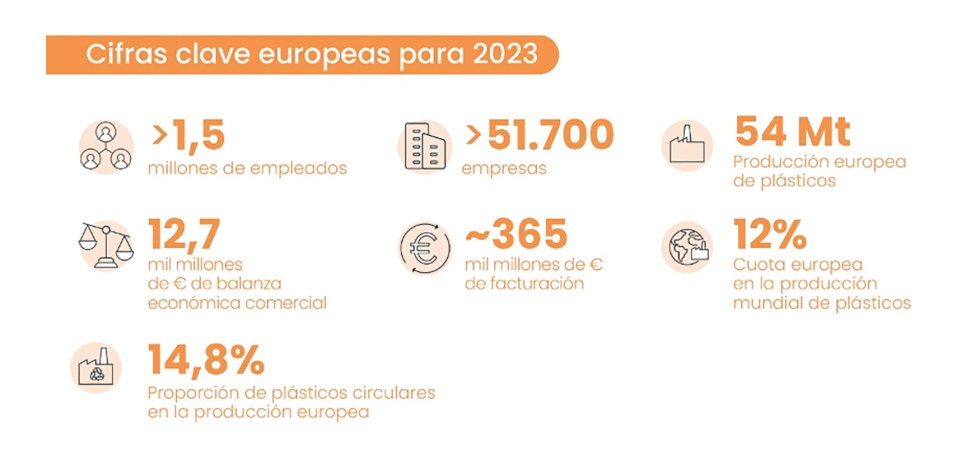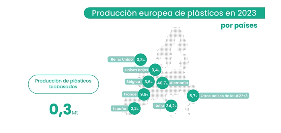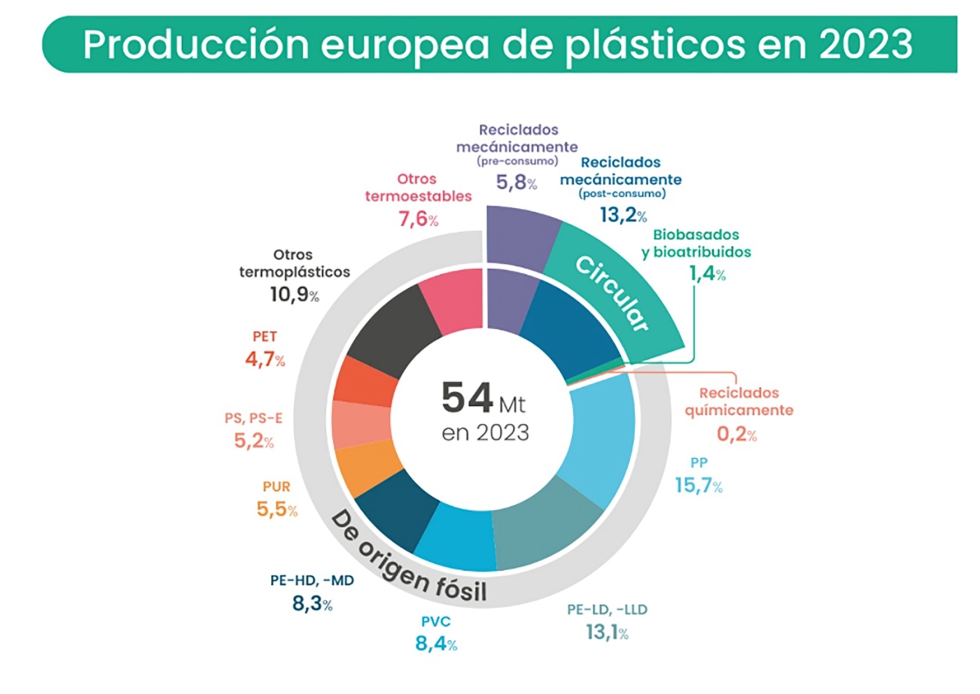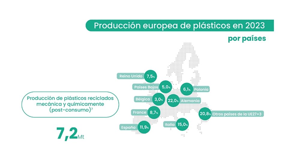 El país es el 5º productor de plásticos en Europa con algo más de 4,5 millones de toneladas producidos en 2023, por detrás de Alemania (10,5 Mt), Bélgica (6,5 Mt), Francia (5,3 Mt) y Países Bajos (5,2 Mt).
