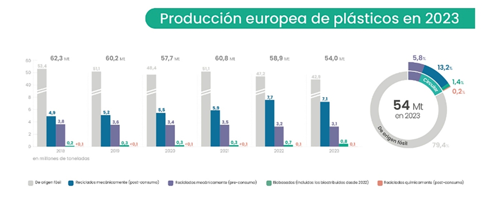 Además de un descenso en la producción de reciclado mecánico, en 2023 solo se produjeron 120.000 toneladas de plástico reciclado químicamente en Europa, mientras que la producción de plásticos biobasados y bioatribuidos aumentó ligeramente, hasta superar por primera vez las 800.000 toneladas. Por su parte, la producción de plásticos de origen fósil continúa descendiendo hasta los 42,9 millones de toneladas. En los últimos seis años, Europa ha reducido la producción de plásticos de origen fósil en casi un 20%, mientras que la caída es de más del 9% en un solo año (2022-2023).