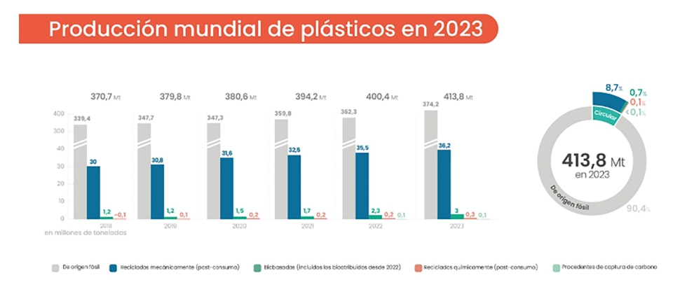 En 2023, la tendencia de crecimiento mundial se mantuvo y se produjeron más de 413 millones de toneladas (Mt) de plásticos. De este total el 90,4% (374,2 Mt) fueron de origen fósil, mientras que el 9,6% (39,6 Mt) restante son plásticos circulares (es decir plásticos que no proceden de fuentes fósiles). Estos se dividen en distintos tipos según su origen: reciclados mecánicamente (8,7%; 36,2Mt), de origen biológico o bioplásticos (0,7%; 3Mt), plásticos reciclados químicamente (0,1%; 0,3Mt), y plásticos por captura de carbono (<0.1%; 0,1Mt).