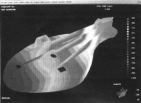 El sistema va almacenando los resultados de los cálculos en un fichero neutro, el cual es prácticamente imposible de interpretar. Debido a ello, ha sido necesario desarrollar una operación de postproceso que permita presentar los resultados de forma clara y comprensible. Esta presentación suele realizarse en forma de gráficos, tablas e imágenes coloreadas. En la Fig.7 puede verse el resultado obtenido tras el cálculo de los tiempos de llenado del molde.