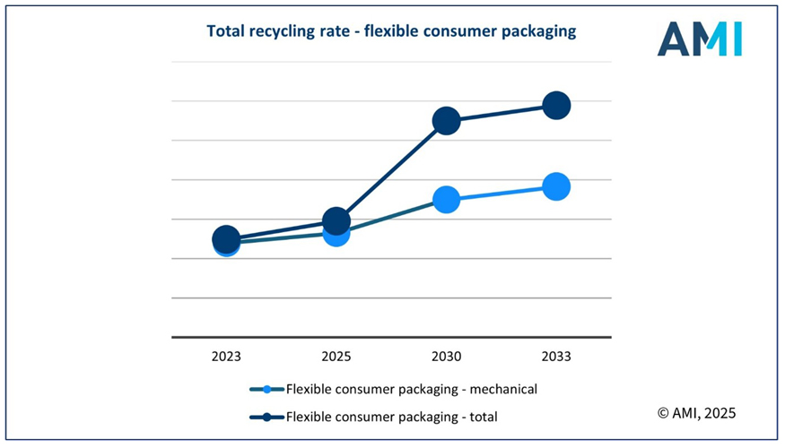 AMI Market Intelligence publicó en octubre de 2025 una edición completamente actualizada de su informe sobre el reciclaje de films flexibles en Europa, continuando el análisis iniciado en 2021. Según el estudio, alrededor de 14,2 millones de toneladas de films flexibles post-consumo estuvieron disponibles en el mercado de la UE27+3 en 2025. Los films de envases de consumo y los de envases industriales representan los mayores volúmenes de material post-uso, situándose en el centro de la legislación europea en términos de tasas de reciclaje, contenido reciclado, mandatos de reutilización y objetivos de reducción de envases.