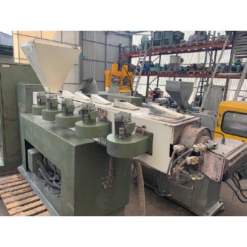 | Detalles | Extrusora 1 husillo - Marca: Amut - Motor de velocidad variable Elektra Faurndau: 7–24 kW (10–33 CV) - Con cuadro eléctrico - Cabezal de hilos para granza: 23 agujeros |
