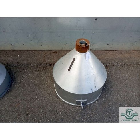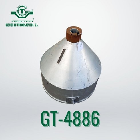 | Detalles | Tolva - Diámetro superior (boca de carga): Ø 600 mm - Altura total: 650 mm - Diámetro inferior (boca de salida): Ø 60 mm - En aluminio - Para inyectora o extrusora |