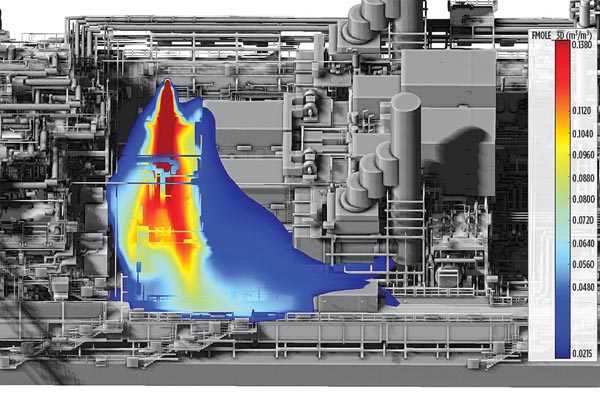 Figura 6.-Simulación de una gran fuga de gas en el módulo M09 (sala de máquinas del buque), para indicar el azul el volumen de gas con 50% del LIE y en rojo la zona con concentraciones dentro del LSE (límite superior de explosividad). Este es uno de los 1400 escenarios de fugas que se simularon, durante el análisis de riesgos
