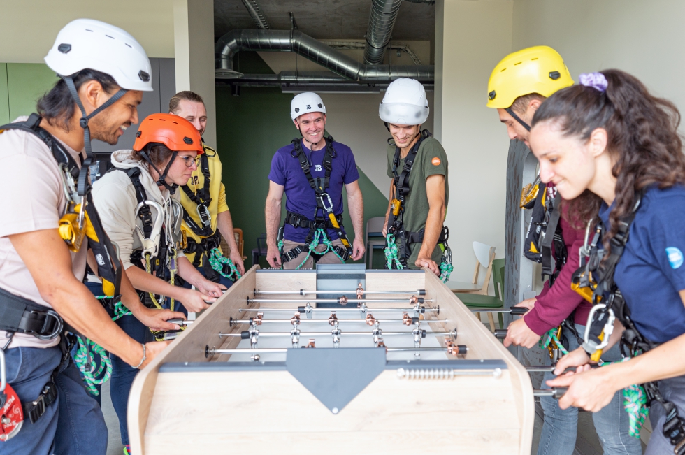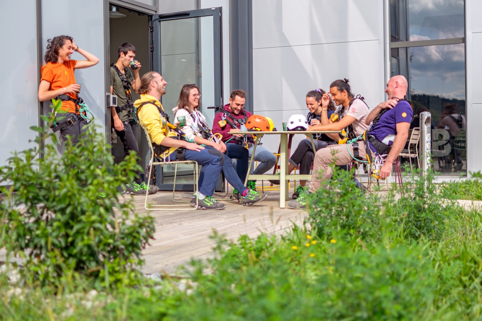 Reconociendo la importancia de los descansos durante las formaciones intensivas, se han creado áreas de descanso cálidas y bien equipadas para fomentar la interacción entre los participantes y ofrecerles un espacio ideal para relajarse. Además, las colaboraciones con proveedores locales, como un gimnasio de escalada y un bar para reuniones informales garantizan un equilibrio entre aprendizaje, confort e interacción social.