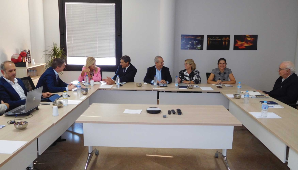 El delegado del Gobierno en Andalucía, Pedro Fernández; la subdelegada del Gobierno en Huelva, María José Rico; el consejero técnico del Ministerio de Industria, Turismo y Comercio, Galo Gutiérrez; y la comisionada especial para la competitividad industrial y la pequeña y mediana empresa del Ministerio de Industria y Turismo, Nuria Aymerich; acudieron a un encuentro con la Junta Directiva de AIQBE al que también asistió la delegada territorial de Economía, Hacienda, Fondos Europeos e Industria, Energía y Minas en Huelva, Lucía Núñez.