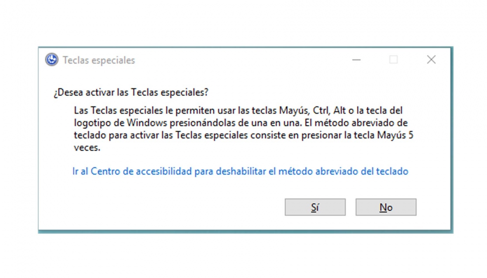 En primer lugar, como viene siendo habitual en los últimos casos estudiados en el laboratorio, los atacantes lanzan un ataque de fuerza bruta contra un servidor que tiene habilitado el Remote Desktop Protocol (RDP). Una vez consiguen dar con las credenciales ya tienen acceso al equipo. Lo primero que hacen los cibercriminales es ejecutar el fichero sethc.exe con el parámetro 211 desde la ventana de comandos del sistema (CMD). Esto activa las 'Sticky Keys' ('Teclas especiales' en español). Seguro que has visto este mensaje con anterioridad: