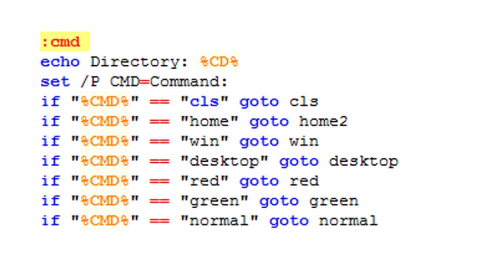 Tiene implementados algunos atajos para poder acceder a determinados directorios, cambiar de color la consola, además de los comandos típicos de línea de comandos.