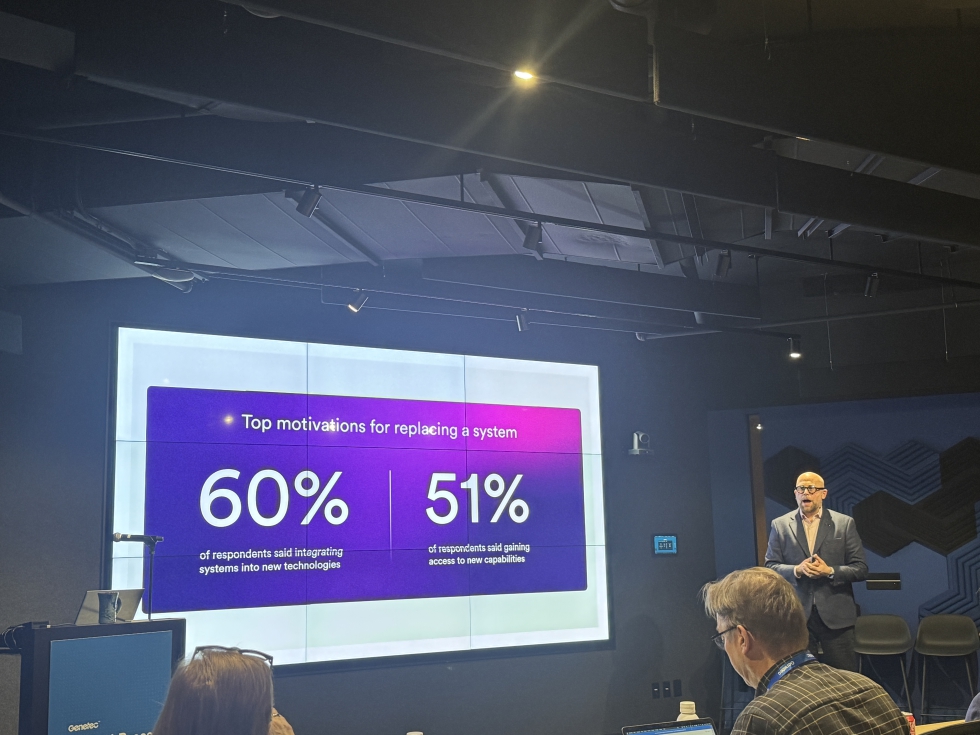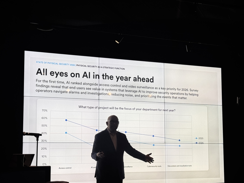 Andrew Elvish, vicepresidente de marketing de Genetec, articuló su intervención en torno a la sexta edición del informe State of the Physical Security Industry, que en 2026 ha recogido la opinión de 7.300 profesionales a escala global.