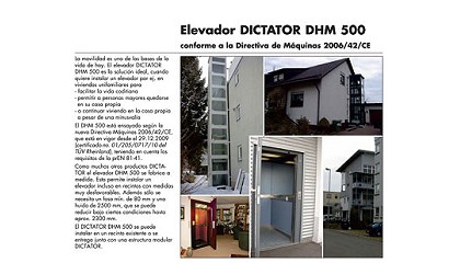 Dictator ha estado trabajando para evolucionar su producto y, tras la entrada definitiva de ésta, disponer ya del producto totalmente conforma a las nuevas disposiciones. Elevador vertical modelo DHM 300, en las instalaciones