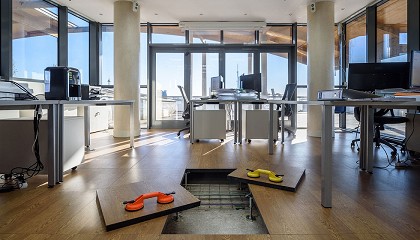 Polygroup. Detalles del suelo registrable Gamaflor Full Steel con revestimiento superior de vinilo de Polygroup. Fotos Javier Bravo. En concreto se han servido de sus suelos para la reforma de la planta