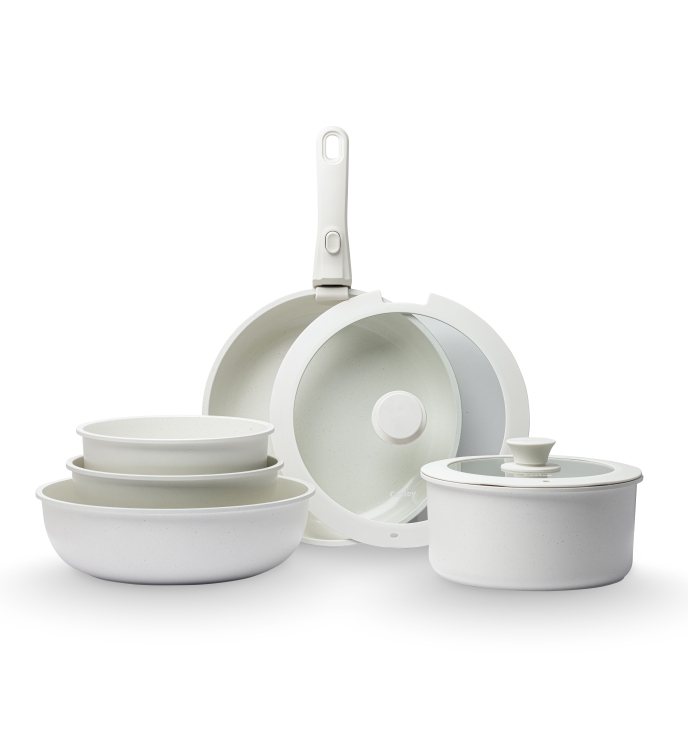 Para quienes buscan versatilidad y optimización del espacio, la Batería Castey White es una opción innovadora. Este set completo incluye sartenes, cacerolas y un wok, además de un práctico mango extraíble que se adapta a todas las piezas. Fabricada en aluminio fundido, garantiza un calentamiento uniforme y eficiente, reduciendo el consumo energético y mejorando la cocción. Su acabado blanco aporta un toque cálido y contemporáneo a cualquier cocina. Su revestimiento antiadherente, libre de PFAS, es resistente, seguro y respetuoso con el medioambiente.