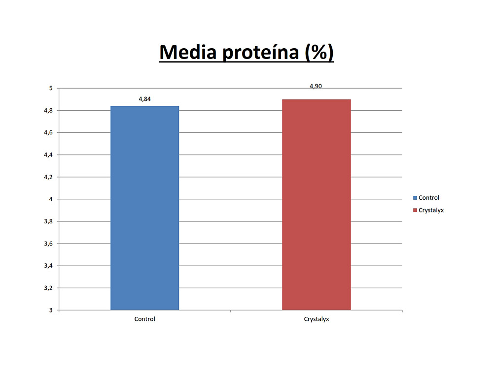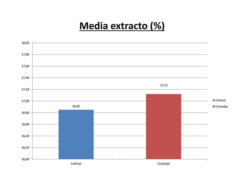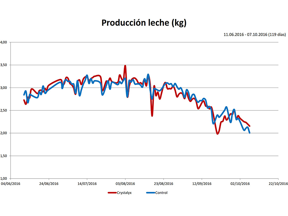 Durante los cuatro primeros meses de lactación, la producción de leche fue similar en ambos grupos (2,869 vs 2,864 Kg de media diaria). En cuanto a la calidad, se observó durante los 5 controles lecheros analizados (periodicidad mensual) una mejora del extracto seco a favor del grupo Crystalyx. Además, los parámetros inferiores de urea, acetona y BHB indican un mejor metabolismo proteico y una menor utilización de reservas grasas por parte del animal.
