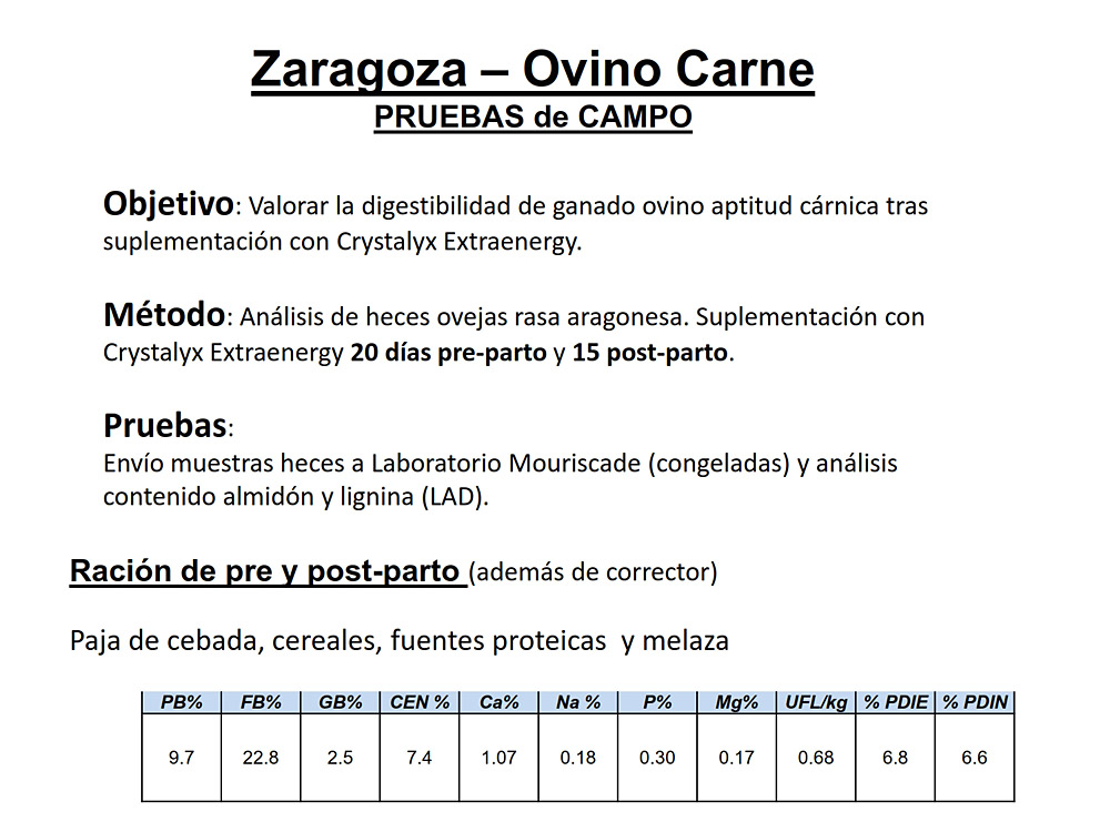 Los resultados del ensayo (Tablas adjuntas) indican que en los 119 días de estudio se obtuvieron 2,27 € más por oveja en el lote cuya alimentación se ha suplementado con Crystalyx.